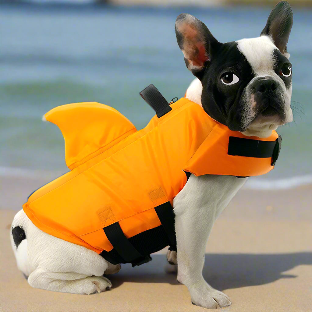 But what sets our life jacket apart is the playful shark fin design on the back. Not only does it add a touch of excitement to your dog's swimwear, but it also serves a practical purpose. The shark fin acts as a visual aid, helping you locate your furry companion effortlessly in the water. Now, you can relax and enjoy the swim knowing that your dog is safe and easy to spot.
